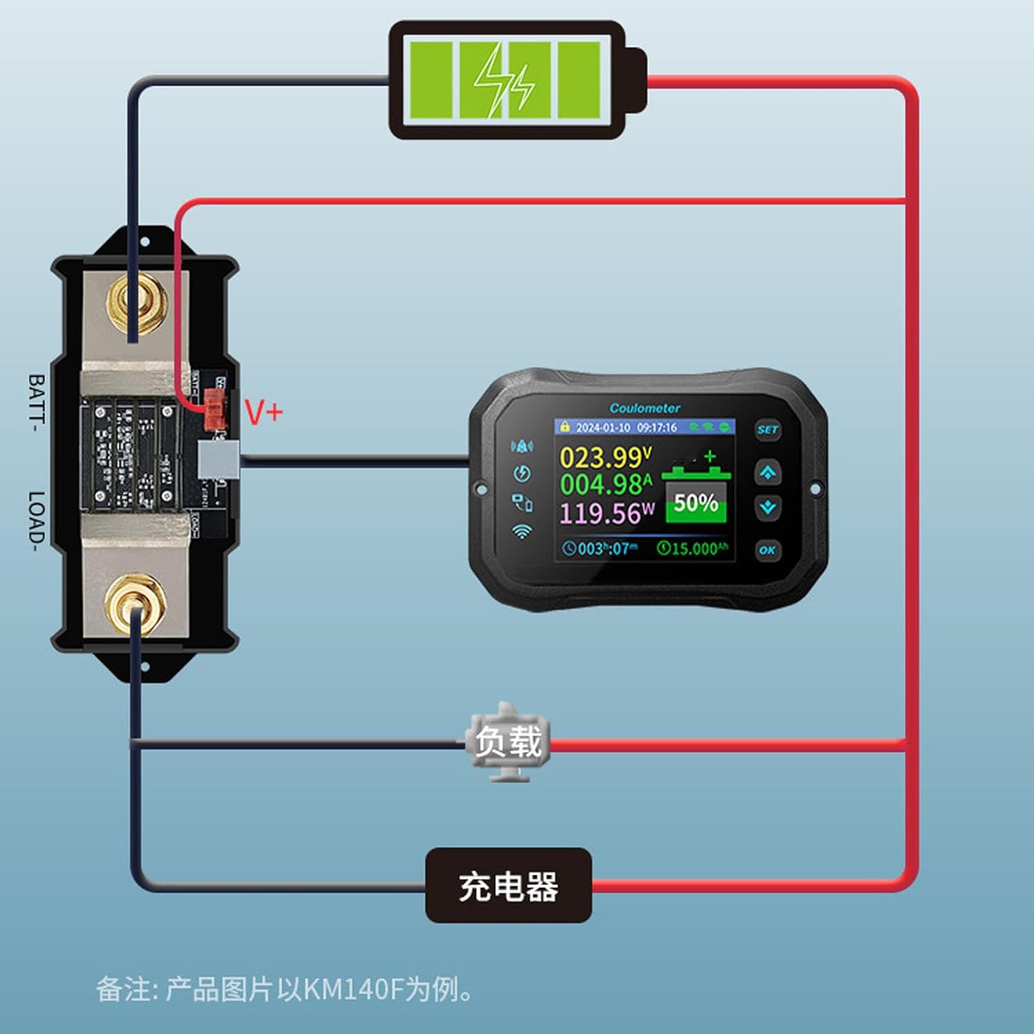 Specification: Item Type: Battery Monitor Model: KM140F Material: ABS, Brass, Silicone Screen Size: 2.4 Inch Sampling Method: Shunt Voltage Testing Range: 10-100V Current Testing Range: 0-400A Current Resolution: 0.01A Capacity Display Range: 0- Power Testing Range: 0-40KW Power Resolution: 0.0001W Ah Testing Range: 0-9999.9Ah Capacity Resolution: 0.001Ah Connection Distance: Approx. 10m / 32.81ft Connection Distance: Approx. 10m / 32.81ft Remote Connection Range: Global Voltage Accuracy: ±5%+0.02V Current Accuracy: ±2+0.01A Sampling Rate: 5 times / second Display Power Consumption: 0.9W Screen Off Time: 10S, 20S, 30S, 40S, 50S, 60S, AUTO (Screen on when discharge current ≥30mA, screen off when discharge current 20s) How to Use: Follow the user manual. PackageList: 1 x Battery Monitor 1 x Sampler 1 x 1m Red Positive Wire 1 x 5m Communicating Line 1 x Manual Notice: Before first use, you need to correctly set the battery's effective capacity and current remaining battery percentage. If the battery's effective capacity or current remaining battery level is unknown, follow these steps: 1. the battery fully. 2. Enter the preset battery capacity setting in the system settings, for example, if the battery's rated capacity is 150AH, set 150AH as the preset battery capacity (you can check the rated capacity on the battery nameplate or consult the battery manufacturer). 3. Set the remaining capacity percentage to , then discharge the battery group. 4. After discharging, the remaining capacity value displayed on the monitor is 10AH. The preset capacity value of 150 minus the remaining 10 equals the actual battery capacity of 140, meaning the battery has discharged a total of 140AH and cannot be fully