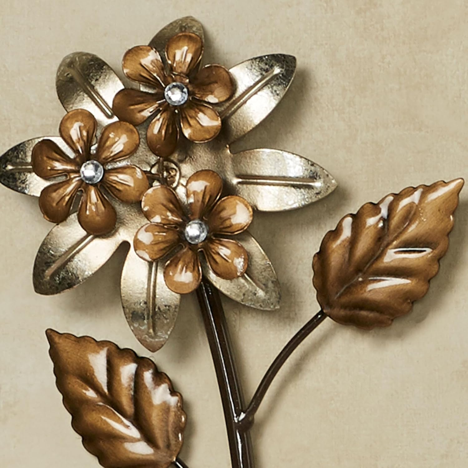 Metallic finishes sparkle with elegance from the Bellissa Wall Sconce. Resembling a magnificent everlasting flower bouquet, the dark brown metal stems have champagne bronze leaves, champagne bronze flowers with silver leaf detailing, and clear acrylic gem accents, ideal for gift giving or enhancing your home decor. The two curving candlecups hold your pillar candles, up to a 3" dia.; we recommend the use of your flameless LED pillar candles. Overall, charming flower bouquet wall sconce measures 16"Wx5"Dx19"H.Never leave a burning candle unattended.