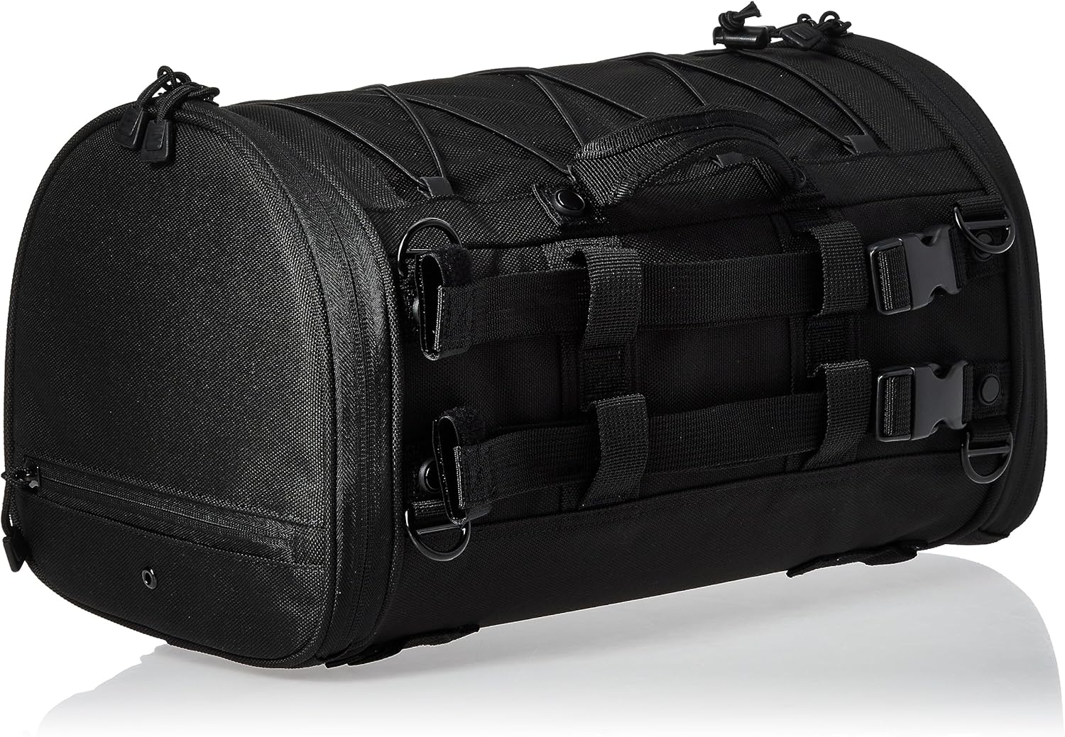 The Kuryakyn 5213 Momentum Rambler motorcycle roll bag offers a variety of convenient universal mounting options, including the passenger seat, luggage racks, sissy bar, or to other Kuryakyn Momentum series luggage bags. This versatility is ideal for day trippers needing minimal storage, or long-haul tourers looking for an easy way to securely strap additional luggage to existing gear. This roll bag is UV-rated, and has weather resistant 1200 denier textile construction, and includes a removable rain cover. The rigid structure retains its shape whether loaded or empty. Convenient side entry doors and a front stash pocket allows for easy access to items while mounted. Integrated MOLLE (Modular Lightweight Load-carrying Equipment) attachment points and multiple D-rings provide additional easy and secure mounting options. An external adjustable bungee storage system secures a coat, bedroll, and more. Bottom-mounted tie-down loops allow for mounting on luggage racks, and a quick-mount sissy bar strap design for secure mounting in seconds. The Kuryakyn 5213 Momentum Rambler roll bag measures 15.5" L x 9.25" W x 9" H, with 1,290 cubic inches (21 liters) by volume. It's equipped with a low-profile carrying handle and a removable shoulder strap for easy portability off the bike.