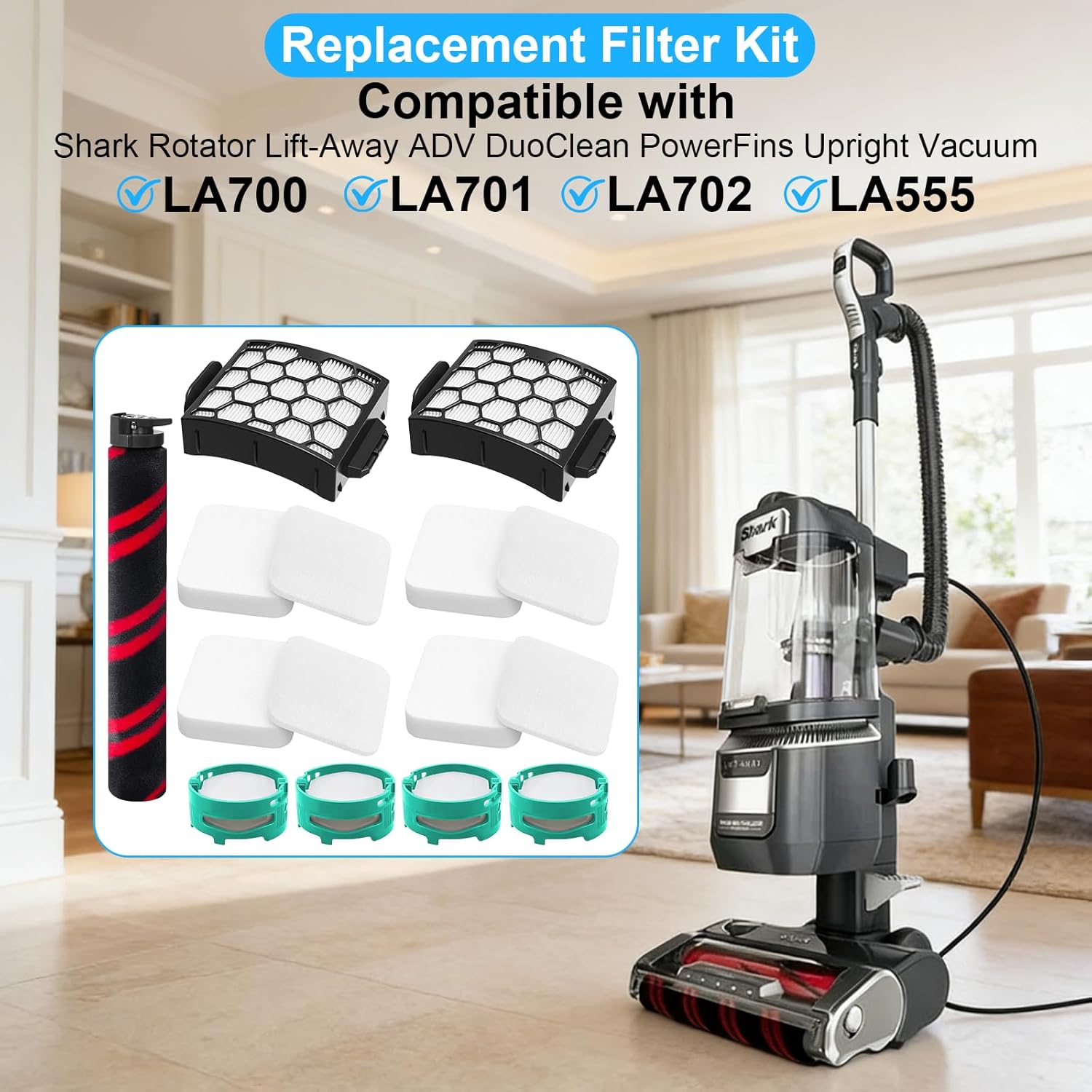 Complete Maintenance Solution for Shark Rotator DuoClean PowerFins Upright Vacuums This replacement accessories kit is designed to support the routine upkeep of Shark Rotator Lift-Away DuoClean PowerFins upright vacuum cleaners. Compatible with LA702, LA555, LA700, and LA701 models, each component is engineered to align with the original fit and airflow structure for reliable installation and long-term use.Compare to part numbers XHF320, XHFLA700, XFFK320, 1541FC3000 Balanced Cleaning Performance Across Common Household Surfaces The Soft Roller Brush is designed to maintain consistent contact with hard floors while supporting smooth debris movement during everyday cleaning. When paired with refreshed filters, it helps the vacuum operate efficiently without unnecessary resistance caused by worn accessories Layered Filtration and Internal Airflow Support The combination of HEPA filters, foam & felt pre-filters, and Odor Neutralizer Cartridge replacements supports internal airflow management by reducing dust buildup and minimizing residual odors inside the vacuum system. This structure helps maintain a cleaner internal environment during operation Designed for Cost-Effective, Long-Term Use Washable and reusable components allow for regular maintenance and rotation. Keeping replacement filters, roller brush, and odor cartridges on hand helps prevent performance decline caused by clogged or aged accessories, extending the usable life of the vacuum system Simple Installation with No Tools Required All components are designed for quick removal and installation. For best results, clean filters regularly and replace worn parts every 2–3 months depending on usage frequency and household conditions Package including 1 Soft Roller Brush 2 HEPA Filters 4 Foam & Felt Filters 4 Odor Neutralizer Cartridge 1 Cleaning Brush