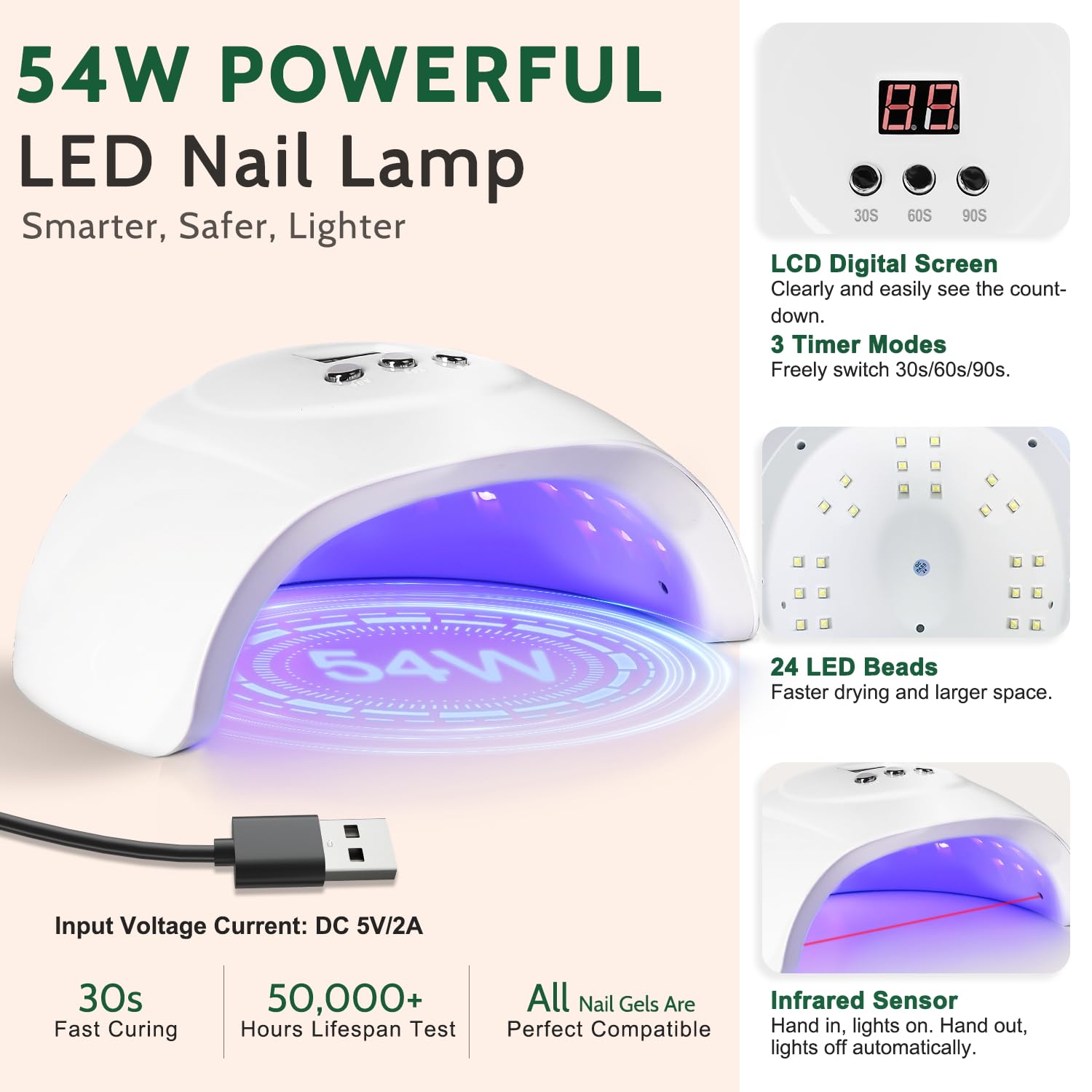 | Included Components | 1 54W LED nail dryer lamp, 1 glossy no-wipe top coat, matte top coat, builder base coat, and nail primer, 10 remover foil wrap and 54 nail decal stickers, 16 essential starter gel manicure tools, 45 gel nail polish colors kit |
