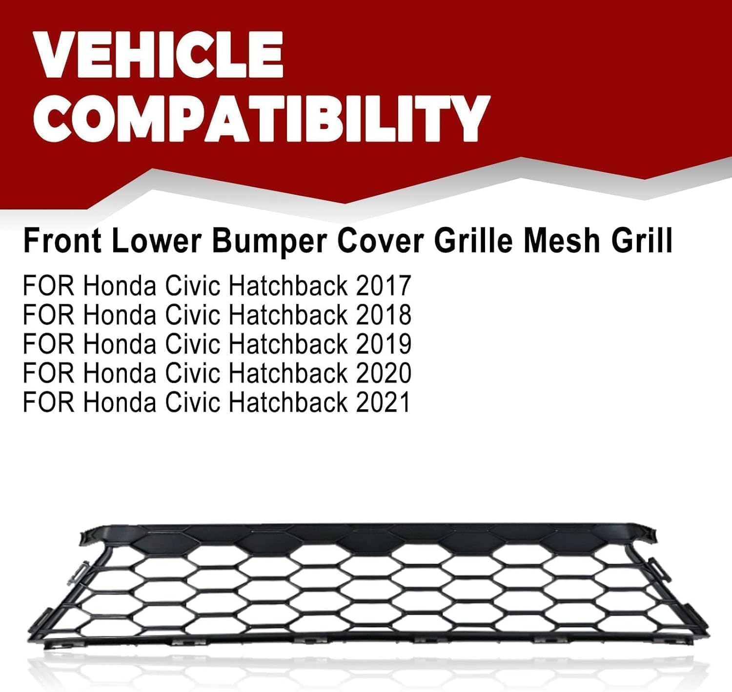DescriptionFitment:Compatible with Honda Civic Hatchback 2017 2018 2019 2020 2021Part Number:1KPHD1211044, 71107TGGA50, HO1036131, 104-60909Package Included:1 x Front Bumper Grille