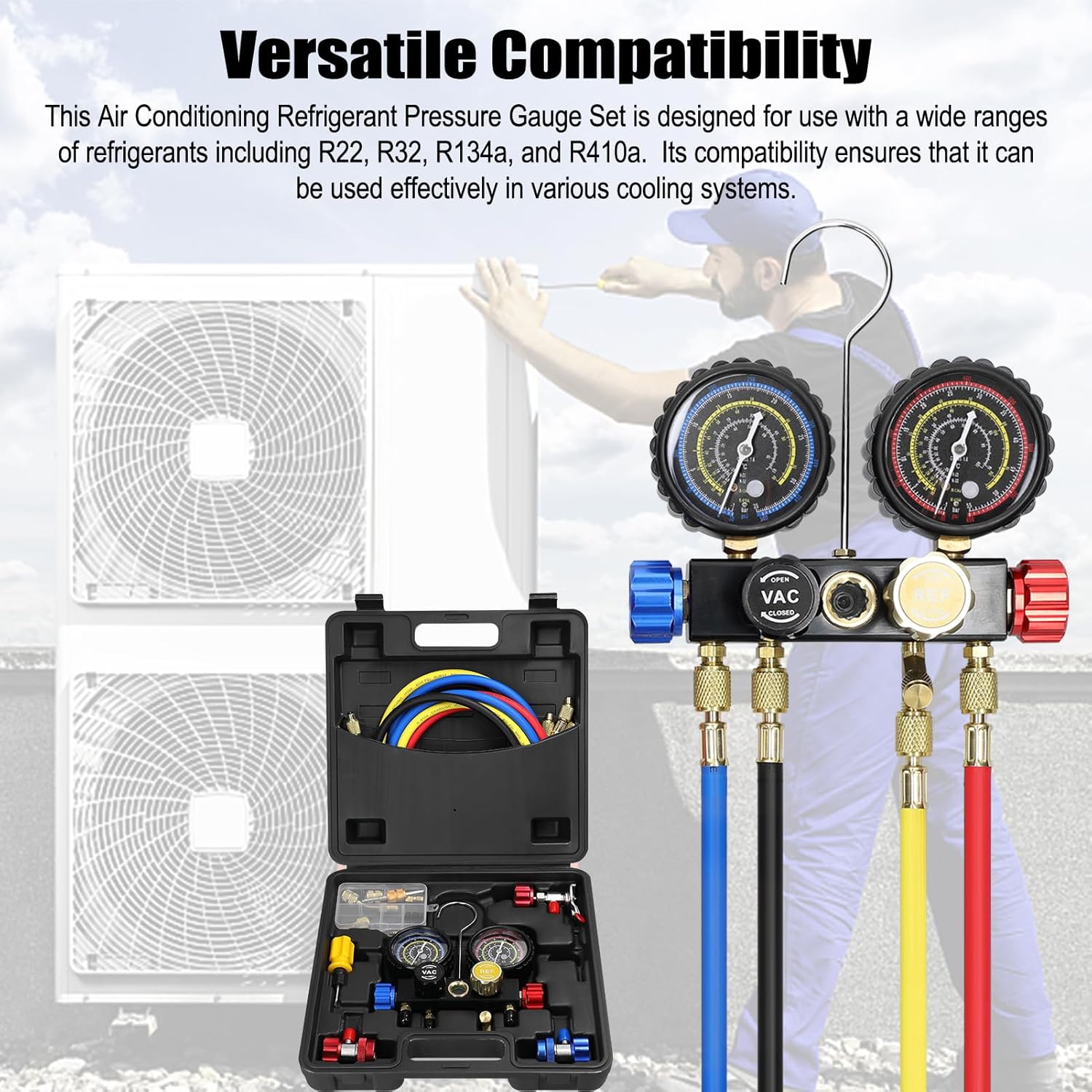 Versatile Compatibility: This Air Conditioning Refrigerant Pressure Gauge Set is designed for use with a wide s of refrigerants including R22, R134a, and R410a. Its compatibility ensures that it can be used effectively in various cooling systems. Premium Quality Construction: Crafted with a sturdy all-metal valve body, this pressure gauge is built to withstand rigorous usage and enhance work efficiency. The engineered-grade plastics housing provides comprehensive ing and extends the lifespan of the gauges. Accurate Measurements: Featuring a dual-valve four-way brass pressure gauge, it includes low-pressure gauge ranging from -30 to 500PSI and a high-pressure gauge ranging from -30 to 800PSI. The clear scale markings ensure accurate readings for precises diagnostics. Convenient ings Design: With the included hook, the gauge can be easily hungon your vehicle or any desired location, providing effortless accessibility during use. Its user-friendly design adds convenience to your refrigerant pressure testing and maintenance tasks. Specifications: Material: Brass + Aluminum Alloy + Rubber Applicable Refrigerant: R22, R134A, R410A Refrigerant Charging Hoses: 800 PSI working pressure and 4000 PSI burst pressure Hose Length: 1.5m/ 5ft Gauge Size: 180 * 160 * 60mm/ 7.1 * 6.3 * 2.4in Box Size: 305 * 308 * 85mm/ 12.0 * 12.1 * 3.3in Item Weight: 3050g/ 6.7lb Package Size: 320 * 310 * 90mm/ 12.6 * 12.2 * 3.5in Pacakge Weight: 3280g/ 7.2lb Packing List: 1 * Manifold Gauge 4 * Charging Hose 1 * Bottle Opener for Refrigerant R134A 2 * Quick Coupler Adapter 1 * Screwdriver 1 * Dual Purpose Valve Cores Wrench 2 * R410 Adapter 1 * R134 Adapter 1 * Spare Parts Set 1 * Manual