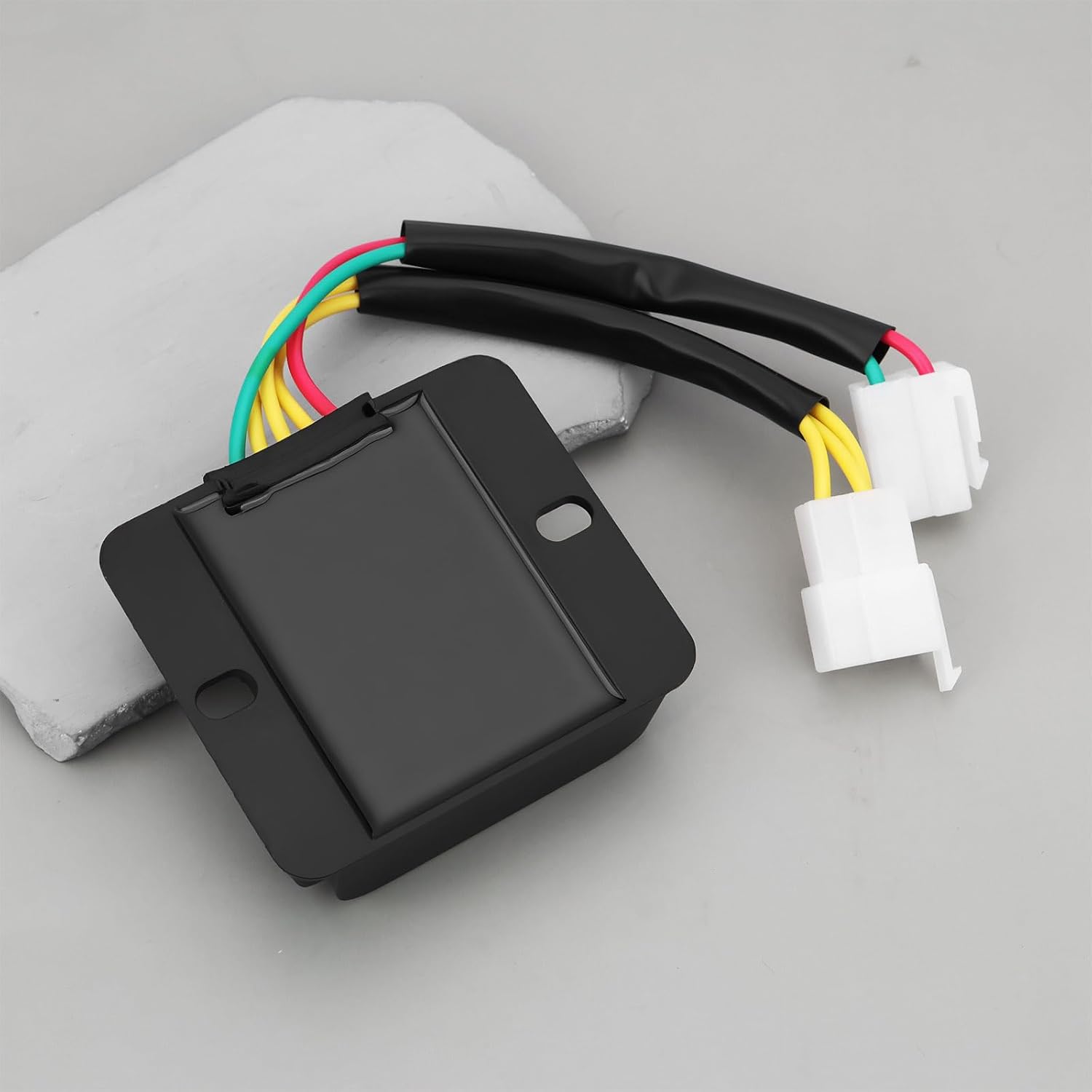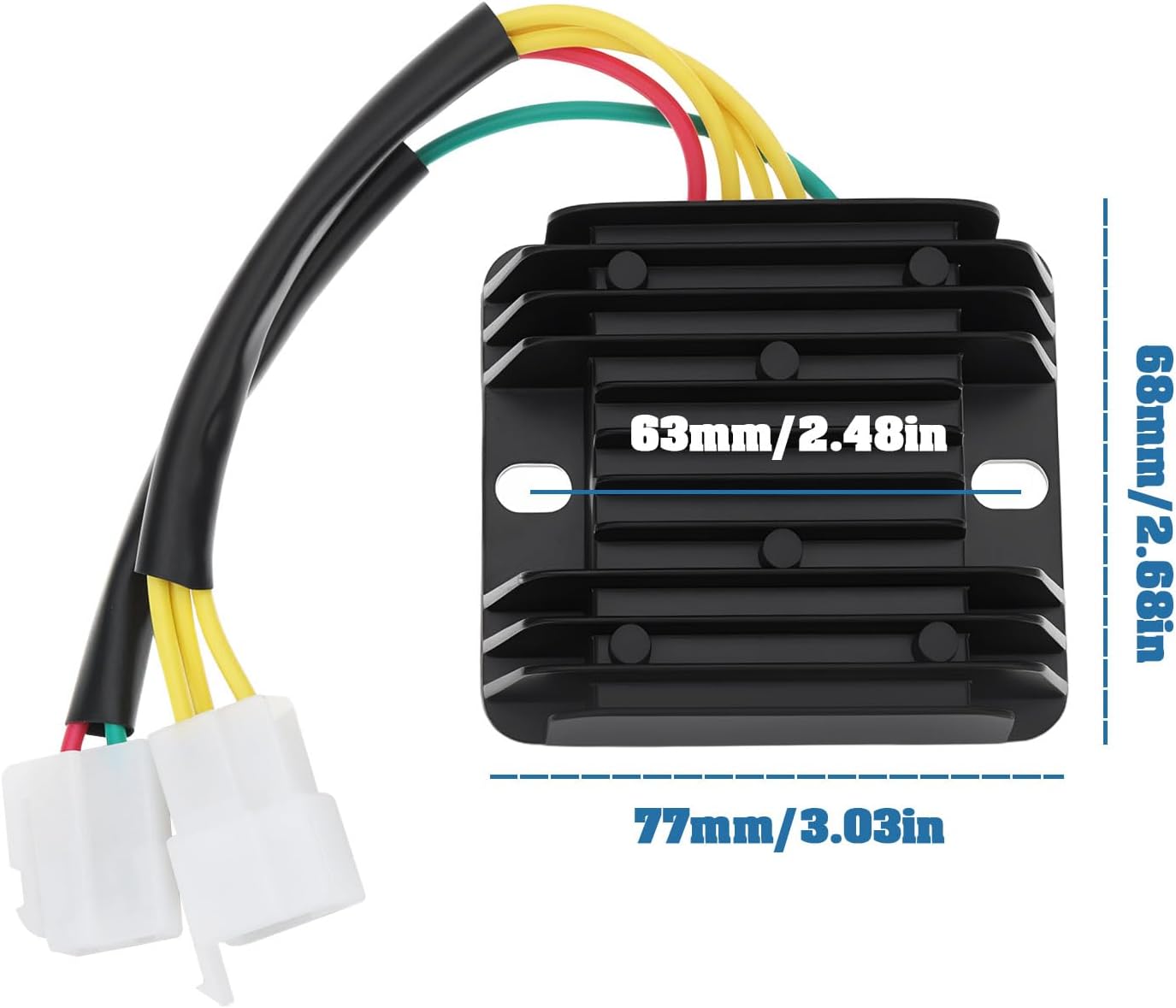 Item Descriptions:-Replacing part numbers: 32800HN9110, 32800HN9120 , which is a direct replacement for the old or broken one.-Compatible with Hyosung MS3-250, GD250N, GT650, GT650S, GT650R (Carb & EFI), GV650 (Carb & EFI), GV700, ST7 EFI (2010+), GV250 EFI Only (2010+), GT250 EFI Only (2010+), and GT250R EFI Only (2010+).-The motorcycle voltage regulator rectifier has dimensions of 77x68 mm and a hole center distance of approximately 63 mm.-Constructed from durable aluminum alloy, ensuring long-lasting operation, corrosion resistance, and stable voltage output even under high temperature conditions.-Regulates and rectifies the motorcycle’s DC12V electrical current, preventing overcharging or voltage fluctuations to protect the battery and ensure optimal electrical system performance.Package:1x Motorcycle Voltage Regulator RectifierItem Specifications:Main Color:BlackMaterial:Aluminum AlloyInput Voltage:DC12VDimensions:77x68mmHole Center Distance Approx.:63mm