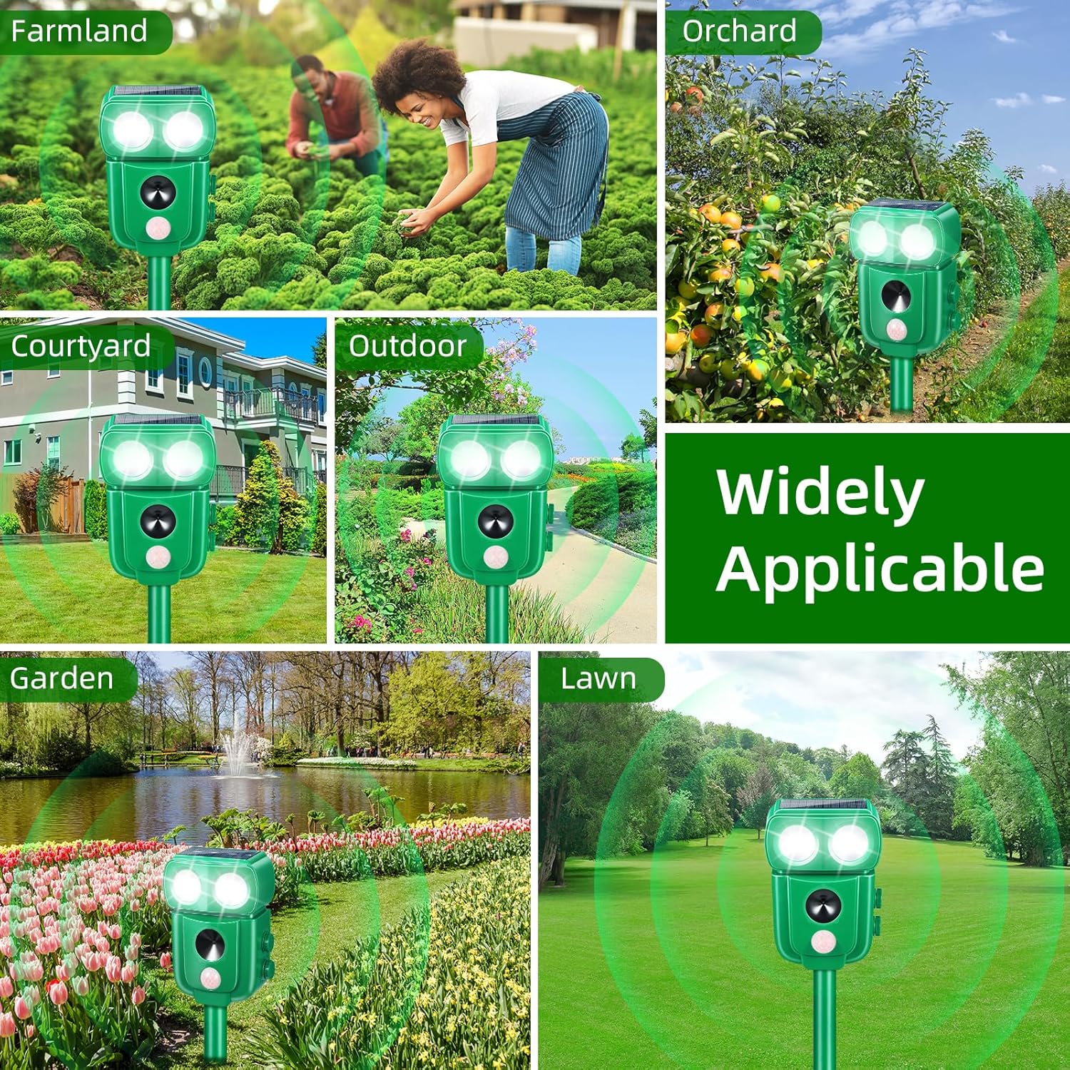 Uses of the Solar Ultrasonic RepellerThe Solar Ultrasonic Repeller is designed to help users maintain outdoor spaces like gardens, patios, yards, farms, and orchards by deterring animals such as cats, dogs, raccoons, deer, skunks, foxes, birds, and more. It helps create a peaceful environment for plants, vegetable patches, flowers, and livestock by minimizing disruptions caused by animals.An effective tool for continuous protection of farms, gardens, yards, orchards, lawn plots and other outdoor places.Your flowers, vegetables, and livestock and other belongings remain undisturbed.Frequency range0 gear: off1 gear: (red light flashes 1 time) 13KHZ-17KHZ, repels animals such as rats, small rodents, etc.2 gears: (Red light blinks 2 times) 16KHZ-25KHZ, repel animals such as large dogs, foxes, etc.3 gears: (red light blinks 3 times) 23KHZ, drive away animals such as small dogs, cats, bats, birds, etc.4 gears: (Red light blinks 4 times) 16KHZ - 45KHZ, Powerful LED lights repel raccoons, boars, martens and more.Key Parameter FeaturesEasy Placement: Can be hung on walls or trees or staked in the ground, making it versatile for different setups.Motion Detection: Equipped with PIR motion sensors that detect animal movement within a 40-foot range and a 110-degree detection angle.Adjustable Settings: Five modes and adjustable volume levels cater to different needs, allowing users to aim specific animals.Dual Charging: Solar and USB charging options ensure it works day and night, regardless of weather.Usage Scenarios and User GroupsHarvest Season: Useful during times when fruit or vegetables are ripening, reducing the risk of animals approaching.Homeowners with Gardens or Yards: Perfect for those who want to keep animals away from flowers, vegetable beds, and patios.Farmers and Gardeners: Beneficial for anyone looking to maintain a disturbance-free growing environment.Pet Owners: Useful for people with pets, preventing neighborhood animals from entering yards.Orchard Owners: Aids in protecting fruit-bearing plants from intrusions.Gardening Season: Ensure gardens are well-maintained and minimize the chances of animals digging up plants.Festivals and Outdoor Gatherings: Keep outdoor areas clear during celebrations, enhancing the experience for guests.Common Questions and AnswersQ: How long does the charge last?A: With solar charging, the device remains powered continuously. It also has a USB charging option, so you can recharge it on cloudy days for consistent operation.Q: What animals does this repeller work for?A: This device is effective for various animals like raccoons, deer, foxes, skunks, cats, birds, and more, helping keep your space free from animal disruptions.Q: Is the ultrasonic sound loud? Can humans hear it?A: The frequency of ultrasound is usually higher than the range of human hearing, while the volume level can be adjusted, so you can choose the right volume and demanded frequency for comfortable daily use.Q: How do I set it up?A: It’s simple to set up—just place it in an area with sunlight, adjust the volume and mode as needed, and use the ground stake or hang it in the desired spot.Q: How far does it detect animal movement?A: The motion sensors detect movement up to 40 feet away, with a 110-degree sensor angle, providing ample coverage for gardens, farms, and yards.Q: Does this work at night?A: Yes, it operates both day and night. The LED light flashes only when motion is detected, alerting animals effectively without constant illumination.Note: The machine is better when placed in a place with plenty of solar energy.