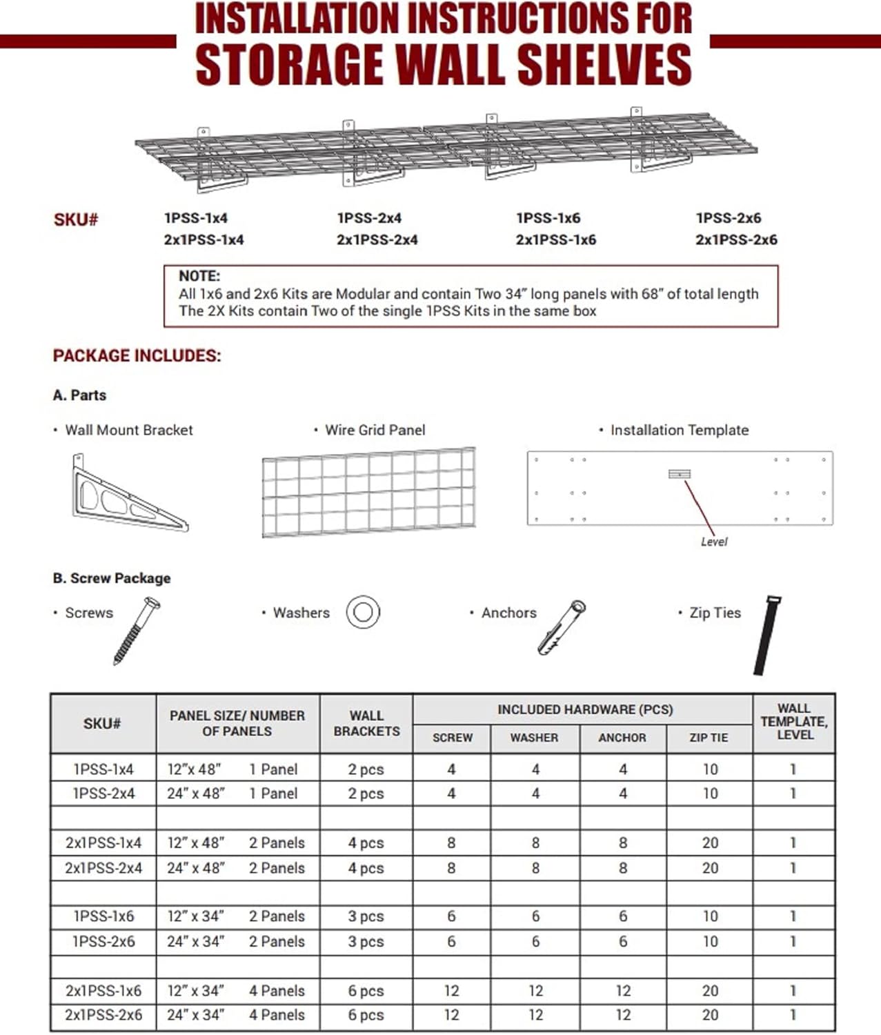 Our Unique Modular Wall Mount Racks are designed to allow variety of installation configurations. To choose your configuration options please refer to the provided SKU Sizing and Component Chart. The Heavy-Duty wire grid panels and wall mount brackets come in different sizes starting from 1'x4' up to 2'x6'. Select the Kit that best fits your space in the garage, basement, kitchen, pantry, laundry, or any room. Then using our Joint Brackets, you can easily extend or change the existing configuration, by adding or removing panels. All pre-configured Kits come Hardware and Installation Instructions