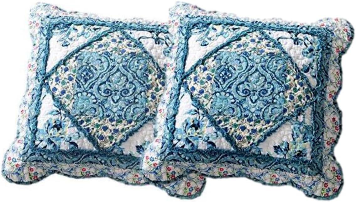 A classic real floral patchwork design will make anyone feel at ease with these Petal Dance shams. This vintage-inspired design will make you feel right at home with its cottage farmhouse design that looks homemade. The floral patchwork pieces give it an antique feel to it and the bright blue and white colors make this versatile design fit to match almost any home decor. These shams are made to match the Petal Dance Cotton Quilt. Dimensions - (Inches) Cushion Covers: 18 x 18 Euro Shams 26 x 26 King Shams: 20 x 36 Queen Shams: 20 x 30. Front side features multiple ditsy floral paisley patterns skillfully pieced together in bright pastel colors, the reverse side is a solid light blue color.